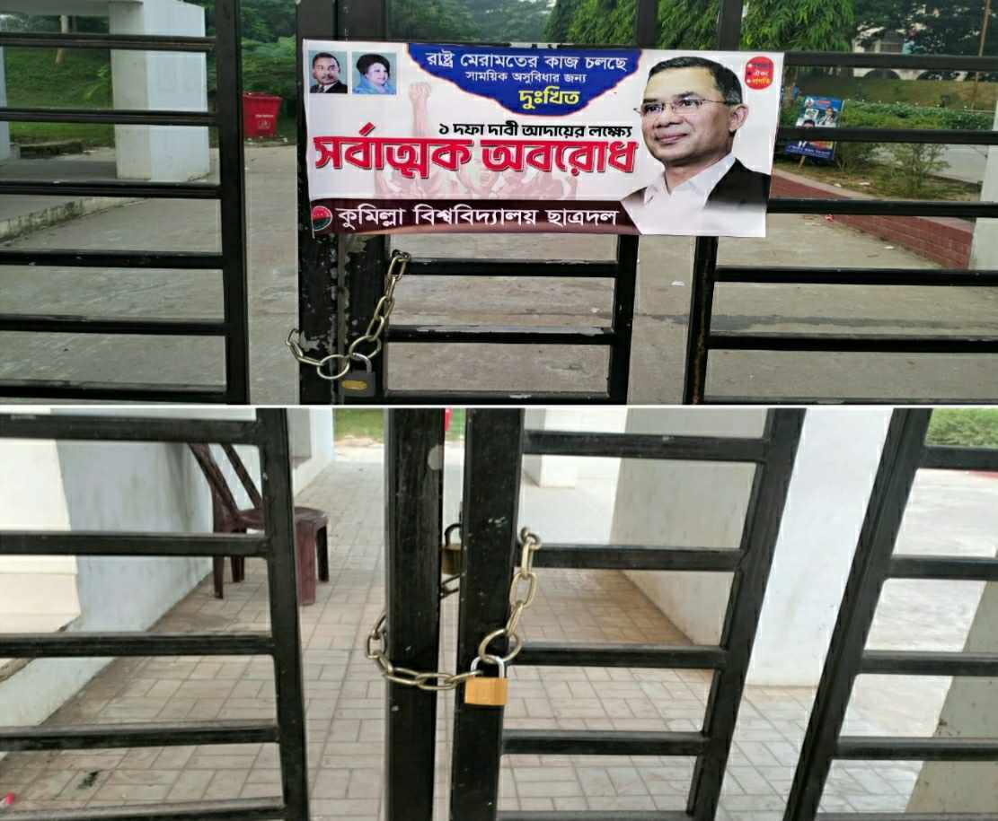 রবিবার (৫ নভেম্বর) সকাল সাড়ে ছয়টার দিকে কুমিল্লা বিশ্ববিদ্যালয় শাখা ছাত্রদলের সদস্য সচিব মোস্তাফিজুর রহমান শুভ সহ ছাত্রদলের আরো কয়েকজন মিলে বিশ্ববিদ্যালয়ের প্রধান ফটকে তালা ঝুলিয়ে দেওয়া হয়।