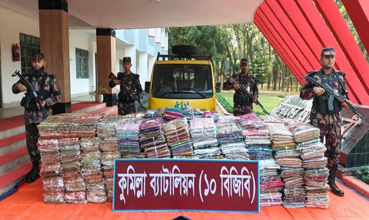 বিজিবি সূত্রে জানা গেছে, শুক্রবার ভোরে কুমিল্লা জেলার চৌদ্দগ্রাম উপজেলার আনন্দপুর বিওপি এলাকার সীমান্তে একটি বিশেষ অভিযান পরিচালনা করা হয়। অভিযানকালে পরিত্যক্ত অবস্থায় বিপুল পরিমাণ অবৈধ ভারতীয় শাড়ি উদ্ধার করা হয়। উদ্ধারকৃত শাড়ির বাজারমূল্য আনুমানিক ৮৮ লাখ ৭২ হাজার টাকা।